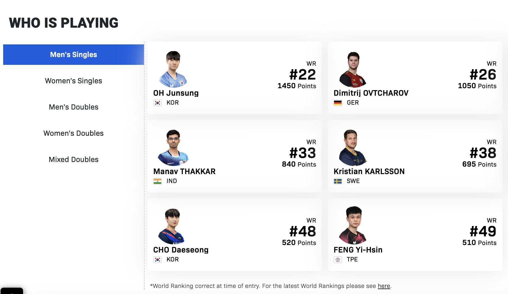 2026年WTT球星挑战赛金奈站将于2026年2月10日至2月15日在印度金奈举行,今天官网公布了参赛名单,男单前四号种子分别是世界排名22的吴晙诚(韩国),世界排名26的奥恰洛夫(德国),世界排名30的科顿(法国),世界排名32的泊雷特(法国)。